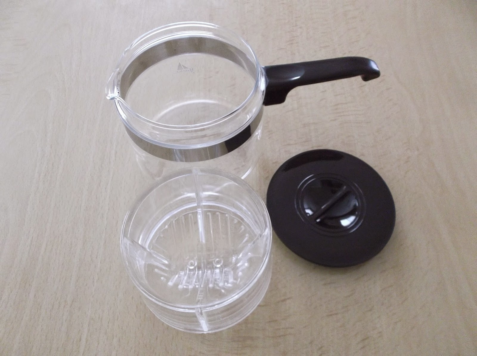 (A set of a lid, a plastic dripper, and a glass carafe for 5 cups (plus some paper filters), all for 500 yen! Several months ago, I found it at the second hand store, and I just had to grab it.)(蓋、プラスチック製のドリッパー、5人用のガラスのサーバー(それにペーパーフィルターが少し)のセット、全部で500円!数か月前、リサイクルショップで見つけて、即(そく)買いました。)