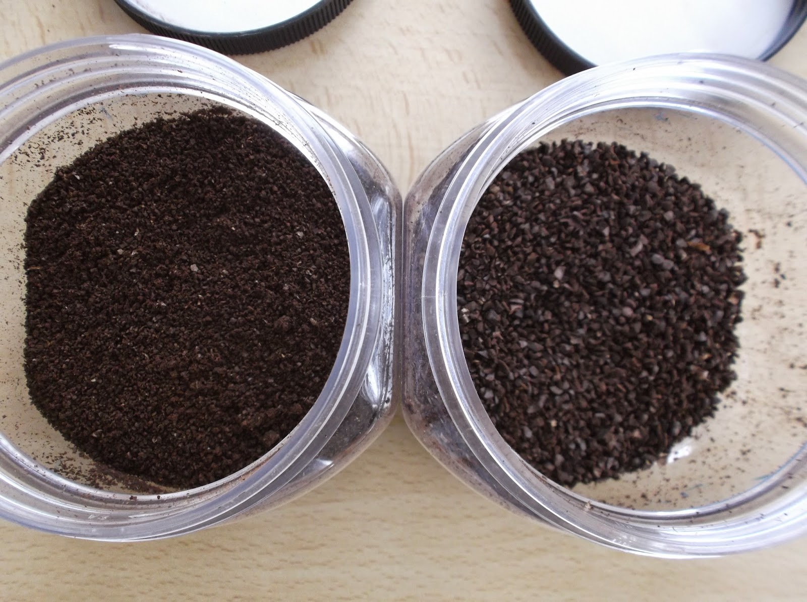 最近購入したミルR-440は、挽き具合の設定が1~10までの10段階あります。設定1(左)と設定10(右)で挽いたコーヒー豆の写真です。