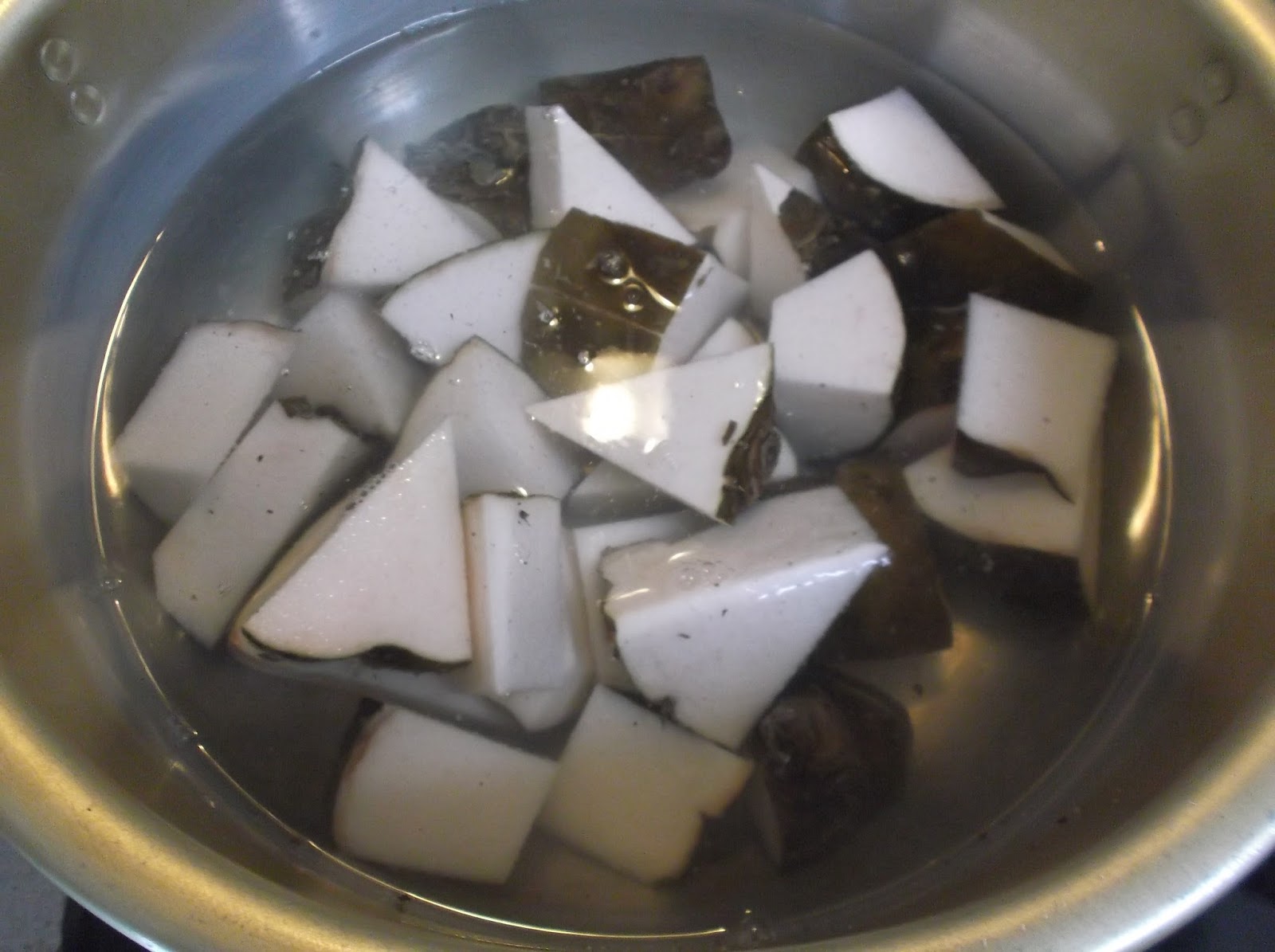 13. Let sit for 20 minutes or so. (You may want to transfer the contents of the pot to a tupperware container or something, if you want to make rectangular konnnyaku.)