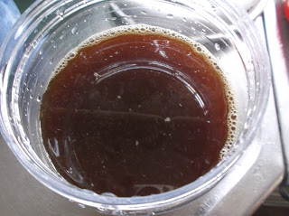 6. Combine juice, dashi (for me, water + instant dashi), and soy sauce at your desired ratio (for me, 1:1:1). Add some dried bonito shavings (katsuobushi) and kombu (I simply left them out).